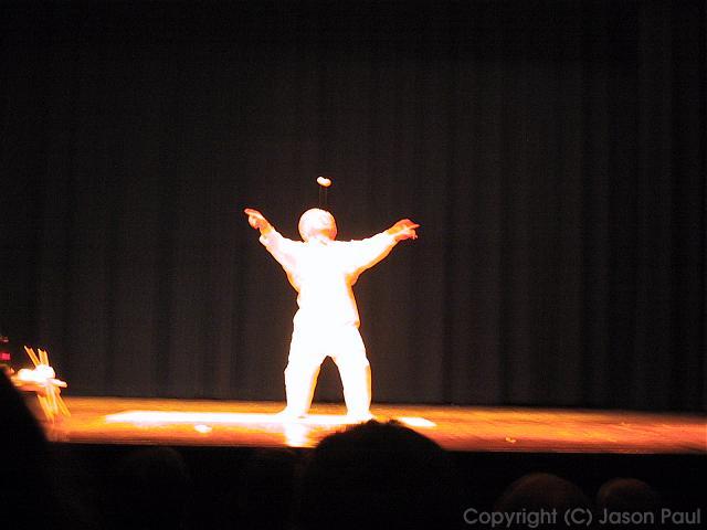 A chopstick balanced on his nose and a raw egg placed on the end of the chopstick